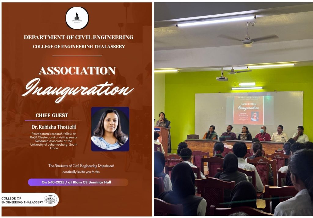 6 October 2025. Rahisha was invited as the Chief Guest for the Civil Engineering Association Day at the College of Engineering Thalassery, Kerala, and delivered a talk on “Spatial Insights for Urban Planning: The Future of Civil Engineering.”